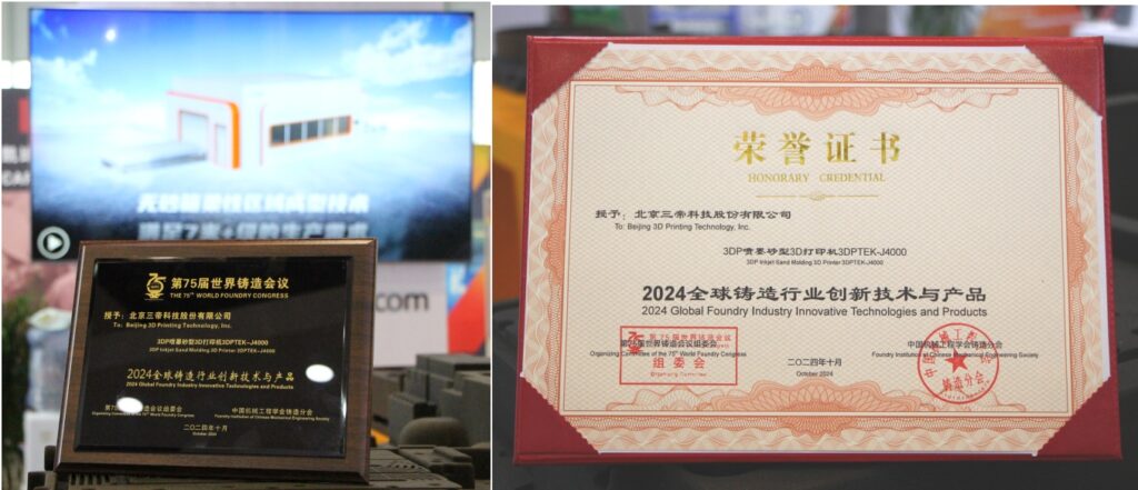 2024年10月26日,由世界鑄造組織(WFO)主辦、中國(guó)機(jī)械工程學(xué)會(huì)鑄造分會(huì)承辦的第75屆世界鑄造會(huì)議暨2024國(guó)際鑄造展覽會(huì)在“中國(guó)重裝之都”四川德陽(yáng)文德國(guó)際會(huì)展中心隆重開幕,百余家中外知名企業(yè)同臺(tái)展示全球鑄造領(lǐng)域創(chuàng)新技術(shù)及產(chǎn)品,千余名專家學(xué)者同聚共話全球鑄造行業(yè)發(fā)展。國(guó)內(nèi)領(lǐng)先的3D打印裝備與快速制造服務(wù)提供商北京三帝科技股份有限公司攜3D鑄造解決方案參展(展位號(hào):B13),公司自主研發(fā)的超大尺寸3DP砂型打印機(jī)3DPTEK-J4000榮膺“2024全球鑄造行業(yè)創(chuàng)新技術(shù)與產(chǎn)品”。