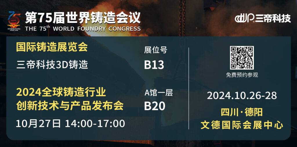 更多詳情,敬請(qǐng)關(guān)注10月26-28日將在四川省德陽(yáng)市隆重舉辦的鑄造業(yè)盛會(huì)“第75屆世界鑄造會(huì)議”,三帝科技將攜3D鑄造解決方案(展位號(hào):B13)登陸展會(huì),并在27日的“2024全球鑄造行業(yè)創(chuàng)新技術(shù)與產(chǎn)品發(fā)布會(huì)”中做精彩分享。